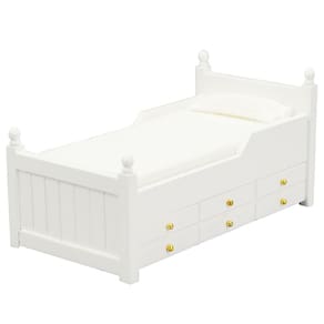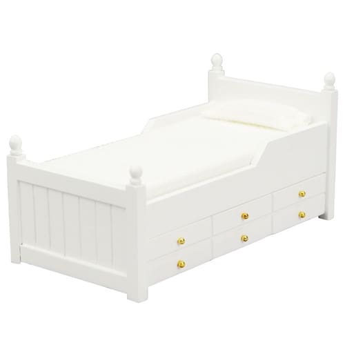 Dimensões: Comprimento 17,2 x largura 8,9 x altura 8,6 cm Altura da cama do chão 6,4 cm Material: madeira Peso: 200 g Cama de madeira elegante: esta cama individual de madeira branca possui postes elegantes e 6 gavetas de armazenamento, perfeita para aprimorar seu quarto de casa de bonecas em miniatura com maior funcionalidade. Artesanato durável: feito de madeira resistente com bordas lisas e limpas e um conjunto de roupa de cama branca macio e realista para uma aparência autêntica na configuração de sua casa de bonecas. Escala e compatibilidade: projetada para minicasas na escala 1:12, esta cama se encaixa perfeitamente com conjuntos de móveis de casa de bonecas e oferece excelente espaço de armazenamento. Lembrete de segurança: este é apenas um modelo de brinquedo, não adequado para uso na vida real. Brinquedo não infantil — evite o risco de engolir ou se machucar em crianças pequenas. Pretend Play Value: ideal para brincadeiras criativas, incentivando a narrativa e a criatividade enquanto decora um quarto em miniatura ou um ambiente de teatro.