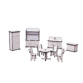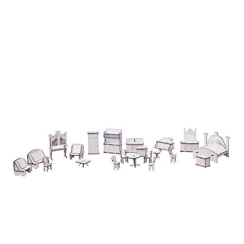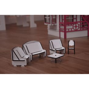 Confeccionado em mdf de 3 mm, o kit de móveis é composto pordiversas peças, as quais se encaixam sutilmente devido a precisão de corte dosmesmos. Não acompanha casinha.