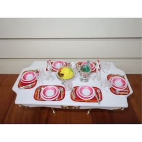O conjunto inclui: 1 mesa, 1 fruta com prato de prata, 2 velas e velas prateadas, 1 garrafa de vinho e balde de gelo, 6 descansos de prato e 48 peças, 6 cadeiras. Pode ser necessária montagem. - Serve para bonecas de 28 cm - Configuração de mesa para 6