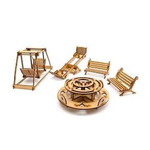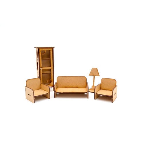 Confeccionado em mdf de 3 mm, o kit de móveis é composto por diversas peças, as quais se encaixam sutilmente devido a precisão de corte dos mesmos. Não acompanha casinha.