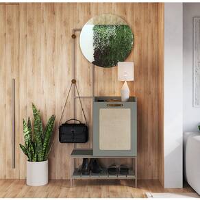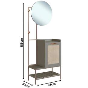 MDPO Móvel Benvindo - Verti/Champagne conta com um toque de modernidade e sutileza. Confeccionado com materiais de qualidade, garantindo sempre uma maior durabilidade da peça. Possui seu tampo em MDP BP 15mm, pés em aço carbono 15x15mm com pintura epóxi na cor Champagne. O espelho tem seu tampo colado em MDF 15mm, na medida de 60x60cm e acabamento em PU na cor caramelo envelhecido. Possui também 2 cabideiros em madeira, puxador em PU e sapatas para evitar danos no chão.