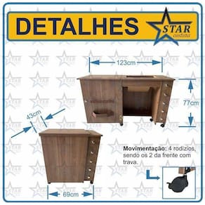 Produto direto da fábrica Gabinete luxo com gaveteiro para máquina de costura doméstica O gaveteiro é o nosso modelo mais completo, com 5 gavetas, é um móvel muito bonito e espaçoso. Para quem quer deixar todas suas ferramentas, linhas, agulhas, tesouras, fita métrica, enfim, tudo bem organizado em um único local, o gaveteiro seria o móvel mais indicado. Esse móvel serve apenas para a máquina especificada no título e fotos desse anúncio. Material: 100% mdf de 15mm de espessura. Mesmo material de móveis planejados de alto padrão. Cor: exatamente igual das fotos deste anúncio. Medidas: Largura: 43cm Altura: 77cm Comprimento móvel fechado: 69cm / comprimento móvel aberto: 123cm Abertura da máquina: conforme modelo da máquina descrita nesse anúncio. Largura interna espaço para as pernas : 49,5cm Itens inclusos: - gaveteiro luxo completo o produto vai desmontado ; - manual de montagem passo a passo detalhado; - kit de rodinhas com trava; - porta cone de linha exclusivo - star costura; - mini catálogo - star costura - com cupom de desconto para próxima compra. Marca: Star Costura Ean: 7793671147244
