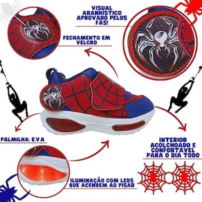 Com o Tênis Mini-pé Infantil de Led Aranha, toda criança está pronta para a brincar e divertir. O tênis possui luzes de LED que acendem a cada passo da criança, iluminando por onde passar! Este modelo foi desenvolvido para conforto das crianças com calce fácil garante a diversão de todos que calçar. Produzido com material têxtil e detalhes em sintético de extrema qualidade, garantindo assim, além de um design exclusivo, muito estilo, conforto e resistência para os pequenos.