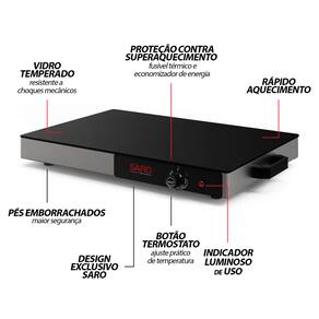 O design único permite a limpeza de forma mais prática e rápida e sua estrutura pode ser adaptada em vários ambientes diferentes. Contém pés antiderrapantes, superfície de vidro temperado, um LED indicador em seu painel, que acende quando a mesa está em uso, proteção de sobreaquecimento por meio de fusível térmico e economizador de energia. A Mesa Térmica pode ser ligada minutos antes do consumo com ajuste prático e individual de temperatura, através do botão termostato.
