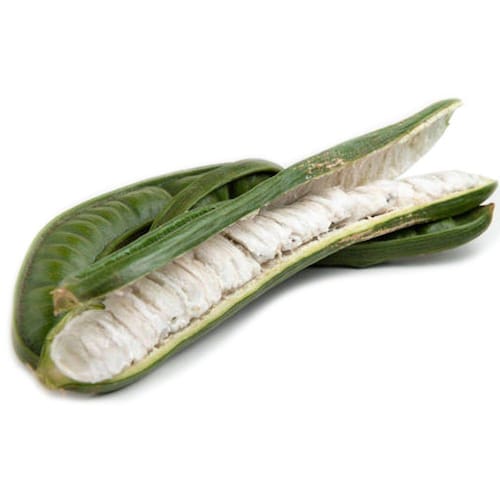 Ingá Feijão Os frutos são pequenos legumes de coloração levemente amarelada quando maduros e pequenas constrições nas sementes. Sua polpa possui propriedade nutritiva, é adocicada de sabor mediano e pode ser consumida ao natural. É uma bela árvore, não muito grande, de folhagem densa e flores brancas. Produz intensa floração de outubro a fevereiro e frutificação de março a maio.