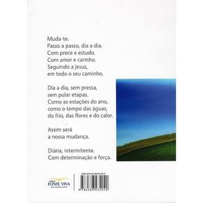 Muda-te. Passo a passo, dia a dia. Com prece e estudo. Com amor e carinho. Seguindo a Jesus, em todo o seu caminho. Dia a dia, sem pressa, sem pular etapas.