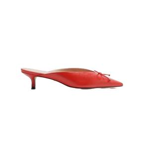 Descrição: Mule vermelha de couro. O sapato tem salto baixo fino e ponta fina. Traz cabedal fechado, com recorte em V e aplicação de laço pequeno. Com palmilha bege e inscrição do nome da marca. Exibe a parte superior do pé e o calcanhar. Referência: A1345600010001