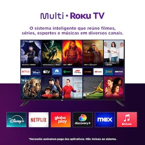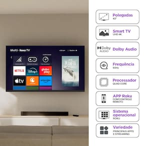 Smart TV, Tela DLED Full HD, Dolby Audio, Processador Quad Core, Atualizações automáticas de software, Espelhamento de tela, Modo Fones de Ouvido via app Roku, Comando de voz via app Roku.Tamanho da tela