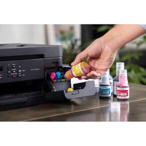 A DCP-T830DW utiliza o novo sistema de garrafas de tinta da Brother com design anti-derramamento, que proporciona recargas rápidas, limpas e seguras, evitando erros de abastecimento.