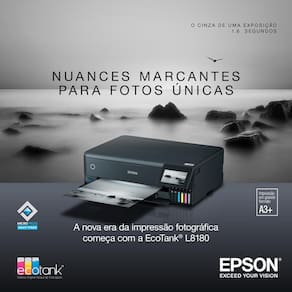 A Epson EcoTank L8180 é uma multifuncional tanque de tinta fotográfica que proporciona impressões coloridas de tamanho até A3+. Excelente qualidade de impressão com o exclusivo kit de 6 tintas Claria ET, incluindo o cinza e o preto pigmentado, e com o sistema de alto rendimento e baixo custo com impressão de até 2.300 fotos em tamanho 10 x 15 cm.