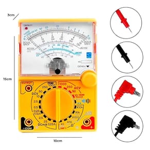 Multímetro analógico portátil teste elétrico precisão O multímetro analógico portátil é a escolha ideal para quem busca precisão, confiabilidade e praticidade em testes elétricos. Com design compacto e estrutura robusta, este instrumento oferece medições seguras e eficientes em circuitos, componentes e instalações elétricas. Seu visor clássico facilita a leitura dos valores, enquanto o seletor de funções intuitivo permite alternar entre diferentes tipos de medição com agilidade. Ideal para profissionais e entusiastas da eletrônica, o multímetro analógico se destaca pela facilidade de interpretação em determinadas medições, tornando o processo mais direto e confiável. Fabricado com materiais de alta qualidade como abs, componentes elétricos e aço, o multímetro possui dimensões aproximadas de 15cm de altura, 10cm de largura e 3cm de profundidade, garantindo portabilidade sem abrir mão da resistência. A cor amarela proporciona maior visibilidade e identificação rápida na bancada ou em campo. Os cabos de teste têm comprimento de 40cm, oferecendo flexibilidade durante o uso. A alimentação é feita por 2 pilhas aa ou 1 bateria de 9v, não inclusas, garantindo autonomia e facilidade de reposição. Entre suas funcionalidades, o multímetro realiza teste de continuidade em diodo e hfe, além de medir tensão contínua dc nas faixas de 0,25v, 0,5v, 2,5v, 10v, 50v, 250v e 1000v, e tensão alternada ac em 10v, 50v, 250v e 1000v. Também mede corrente contínua dc nas faixas de 50ua, 2,5ma, 25ma e 250ma, com precisão básica entre 0,5 por cento e 2,5 por cento. A resistência pode ser verificada nas faixas de 1k, 10k, 100k, 1m e 10m ohms. O equipamento conta com led indicador e sinal sonoro para facilitar a identificação de continuidade, além de comutação de faixa manual com 5 funções. Classificado como categoria cat ii 1000v, é indicado para aplicações em ambientes com baixa energia, como eletrodomésticos e circuitos internos. Este multímetro analógico portátil é perfeito para verificar fusíveis, fiação e componentes eletrônicos com segurança e precisão. A leitura analógica permite identificar variações de forma mais visual, sendo especialmente útil em testes dinâmicos. A confiabilidade do equipamento é reforçada por sua construção sólida e pela presença de funções essenciais para o dia a dia técnico. Itens inclusos no pacote: 01 multímetro analógico, 02 pontas de prova e 01 manual de instruções. Tudo o que você precisa para começar seus testes com eficiência e segurança. O produto conta com de 3 meses contra defeitos de fabricação, assegurando tranquilidade e suporte ao consumidor. Em caso de necessidade, o atendimento é realizado de forma rápida e eficiente, respeitando os prazos e condições estabelecidos. Adquira agora o multímetro analógico portátil e tenha em mãos um instrumento confiável, preciso e fácil de usar. Ideal para quem valoriza qualidade, durabilidade e desempenho em medições elétricas.
