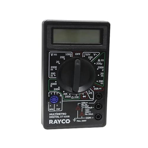 - Marca: Rayco - Modelo: 12441 - Corrente Contínua. - Tensão Alternada - Tensão Contínua - Resistência Ohm - Teste de Diodo - Teste HFE - Leitura de Display: 1999 - Garantia: 90 dias Multímetro Digital para manutenção de equipamentos elétricos. Possui proteção de sobrecarga completa e indicador de bateria fraca. Ean: 7898338093442