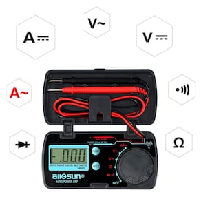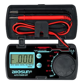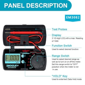 allsun Mini multímetro digital dobrável de alcance automático testador automotivo AC DC Volt AMP Ohm LCD voltímetro de viagem amperímetro testador de continuidade desligamento automático EM3082 - Desligamento automático: Multímetro digital de bolso, desligamento automático, LCD de 3 1/2 dígitos, com um máximo de Leitura de 1999, mais economia de energia. - Recursos atualizados: alcance automático, retenção de dados, indicação de bateria fraca, indicação de overrange, indicação de polaridade negativa. - Multifuncional: o mini voltímetro CC digital é ótimo DMM, tem todas as funções necessárias. Volts CC/CA, amplificadores CA/CC, Ohms e diodo, teste de continuidade com tom. - Alimentação: Alimentado por 2 peças de célula de botão de 1,5 V, LR44 ou equivalente, antes de operar pela primeira vez, você precisa remover a fita isolante da bateria. - Fácil de transportar: design dobrável e portátil, tamanho compacto, estável, preciso e confiável, fácil de transportar e operar.