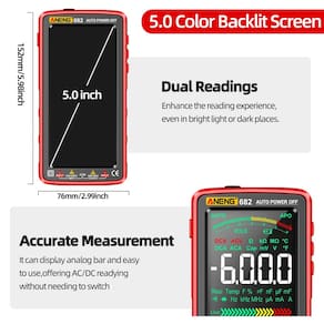 ANENG Testador de multímetro digital colorido LCD TRMS Auto-ranging, 6000 contagens, voltímetro de amplificador ohm inteligente com barra analógica mede NCV, corrente CCC/AC, tensão, resistência, diodos, continuidade, capacitância, temperatura - ?Modo inteligente e tela colorida?O testador multímetro True-RMS de 6000 contagens com tela LCD colorida grande de 5 polegadas melhora muito a experiência de leitura, muito fácil de ler, mesmo sob luz solar intensa ou pouca luz. O multímetro padrão para o modo inteligente. Ele pode identificar o conteúdo de medição e selecionar o intervalo com a melhor resolução, você não precisa fazer nada extra! Adequado para iniciantes e profissionais avançados. - ?Amplamente utilizado e mede com precisão?O multímetro digital pode exibir barra analógica, temperatura em tempo real, alerta de bateria fraca e prompt de fusível danificado. Significa com precisão corrente AC/DC, tensão CA/CC, resistência, frequência, ciclo de trabalho, capacitância, continuidade, diodo, temperatura, fio live/zero. É um ótimo presente para qualquer bricolage e o modo inteligente simplifica para pessoas mais velhas! - ?Recarregável e economia de energia?O multimetro profissional vem com uma bateria recarregável de íons de lítio e cabo de carregamento tipo C, seja uma verificação rápida de continuidade DIY ou um problema complexo, com bom design e leituras consistentes combinam bem para longos dias no campo ou consertos na garagem, você nunca se preocupará com problemas de energia. Se não houver instruções de teste, o testador de circuito entrará no estado de suspensão automaticamente. - ?Precisão e durabilidade? Voltímetro ANENG com testador de tensão sem contato, pode detectar tensão, evitar choque elétrico sem tocar nenhum fio com alarme de som e luz. Tubo de fusível de cerâmica embutido à prova de explosão, proteção de polaridade reversa, indicador de bateria fraca e proteção contra sobrecarga em todas as faixas. O multímetro inteligente é feito de materiais resistentes ao calor e design antiderrapante, vem com uma capa protetora de borracha à prova de quedas, que pode proteger os voltímetros e multímetros, prolongar sua vida útil. - ?Peças e serviços?O pacote deste ohmímetro inclui 1 multímetro, 1 combinação de (4 tomadas de conexão, 2 cabos de PVC, 2 agulhas de cobre, 2 inserções em forma de U, 2 canetas de metro, 2 clipes jacaré, 2 agulhas de perfuração), 1 cabo de teste de multímetro, 1 linha de temperatura, 1 cabo de carregamento, 1 manual de instruções e 1 bolsa de armazenamento. O testador elétrico ANNENG oferece serviço e suporte técnico.