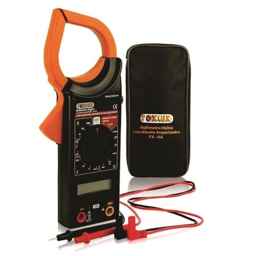 O Multímetro Digital da Foxlux mede tensão contínua e alternada, corrente alternada até 1000A, resistência, e realiza verificação de diodo e continuidade. É ideal para uso de eletricistas, técnicos em manutenção e estudantes em medições de correntes em motores elétricos, redes de distribuição e instalações de difícil acesso.