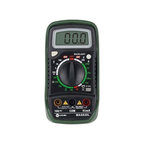 Multimetro Digital Com Data Hold 4 Digitos - Mas830l MULTIMETRO DIGITAL COM DATA HOLD 4 DIGITOS - MAS830L ** ATENÇÃO - PRODUTO NÃO ACOMPANHA BATERIA ** O multímetro digital MAS830L da VINIk é escolha certa para quem necessita aferir aparelhos eletrônicos com precisão e segurança. Com este multímetro é possível medir tensão contínua e alternada (Volts) Corrente (Ampere) e resistência (Ohms). Possui função de backlight, iluminação em caso de lugares com pouca luminosidade. Possui case de proteção com suporte para mantê-lo inclinado e pegada ante deslizante, aumentando a aderência da mão devido a capa de borracha. Display: 3 Dígitos (1999) Tensão DC: 200mV - 600V (0.5% + 2) Tensão AC: 200V - 600V (1.2% + 10) Corrente DC: 200A - 10A Corrente AC: 200/2000/20000/200000/2000000 Ohms Mudança de Faixa: Mudança de Faixa Manual Teste de Transição: Sim; Teste de Continuidade/Diodo: Sim; Data Hold: Sim; LCD Backlight: Sim; Alimentação: 9V - não incluso; Dimensão do Produto: 69x138x31mm; Peso: 170g; Conteúdo da embalagem - Multímetro Digital; - Manual do Usuário; - 1 Ponta de prova; Obs: Bateria não inclusa * A Vinik recomenda a leitura do manual de instrução do aparelho antes de utilizá-lo. MULTIMETRO DIGITAL COM DATA HOLD 4 DIGITOS - MAS830L ** ATENÇÃO - PRODUTO NÃO ACOMPANHA BATERIA ** O multímetro digital MAS830L da VINIk é escolha certa para quem necessita aferir aparelhos eletrônicos com precisão e segurança. Com este multímetro é possível medir tensão contínua e alternada (Volts) Corrente (Ampere) e resistência (Ohms). Possui função de backlight, iluminação em caso de lugares com pouca luminosidade. Possui case de proteção com suporte para mantê-lo inclinado e pegada ante deslizante, aumentando a aderência da mão devido a capa de borracha. Display: 3 Dígitos (1999) Tensão DC: 200mV - 600V (0.5% + 2) Tensão AC: 200V - 600V (1.2% + 10) Corrente DC: 200A - 10A Corrente AC: 200/2000/20000/200000/2000000 Ohms Mudança de Faixa: Mudança de Faixa Manual Teste de Transição: Sim; Teste de Continuidade/Diodo: Sim; Data Hold: Sim; LCD Backlight: Sim; Alimentação: 9V - não incluso; Dimensão do Produto: 69x138x31mm; Peso: 170g; Conteúdo da embalagem - Multímetro Digital; - Manual do Usuário; - 1 Ponta de prova; Obs: Bateria não inclusa * A Vinik recomenda a leitura do manual de instrução do aparelho antes de utilizá-lo. Ean: 7898547287823