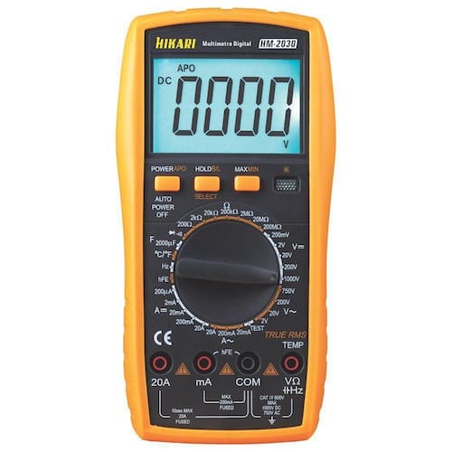 Instrumento digital portátil, com visor LCD de 3 digitos com iluminação de fundo, TRUE RMS, modo Máximo e Minimo, de acordo com a categoria IV de segurança 600V, teste de linha viva, holster protetor, congelamento de leitura, desligamento automático e mudança de faixa manual. Realiza medidas de tensão DC e AC, corrente DC e AC, resistÊncia, capacitÂncia, freqÊncia, temperatura, hFE, diodo e continuidade.