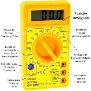 - Medição de Tensão AC/DC; Corrente DC; Resistência Elétrica; Teste de Transistores; Teste de Diodo