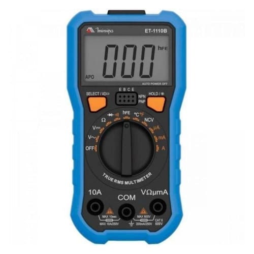 Multimetro Digital Minipa 3 1/2 Et-1110b O modelo ET-1110B é um multímetro compacto, prático e de fácil manuseio. Ele faz medições de corrente AC/DC, tensões AC/DC, resistência, temperatura, teste de diodo, continuidade e hFE. Além das funções de desligamento automático, data HOLD e NCV. *Imagem meramente ilustrativa.