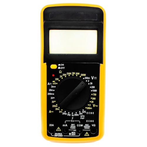 Multímetro digital portátil Produto multifuncional com ampla utilização como oficinas em geral, auto elétricos ou até mesmo em residencias, pois é um instrumentos muito na pesquisa de defeitos em redes, aparelhos eletro-eletrônicos, devido à sua simplicidade de uso e portabilidade. Sua característica básica é a conversão dos sinais ógicos de entrada em dados digitais, sendo esta conversão realizada por circuitos eletrônicos e reproduzidas em seu display visor de lcd. Especificação técnica: Detalhes multimetro digital le-1971 com capacimetro - Protegido por fusível 2 pilhas aaa Dimensões 19cm x 9cm x 3,5cm a x l x p Display: 3-/ digits lcd com leitura máxima de 1000 Indicação de polaridade: - mostra automaticamente Indicação de over-range: only 1 displayed Indicação de bateria fraca Range select: manual Temperatura de operação: 0c to 40c, menos 75%rh Temperatura de armazenagem: -10c to 50c, menos 75%rh Função auto power off: desliga o equipamento depois de 15 minutos ocioso Cor preto e laranja Medições: Resistência: escalas= 200r, 2k, 20k, 200k, 2m, 20m, 200m Teste de continuidade: sim = com bip sonoro Teste de diodo: sim Voltagem ac: escalas = 2v, 20v, 200v, 750v Voltagem dc: escalas = 2v, 20v, 200v, 1000v Teste de transistor: sim Corrente ac: escalas = 2m, 20m, 200m, 20a Corrente dc: escalas = 2m, 20m, 200m, 20a Capacímetro: escalas = 20n, 200n, 2u, 20u, 200u Conteúdo da embalagem: 01 multímetro digital; 01 manual em português 01 par guia de teste; 02 pilhas aaa;