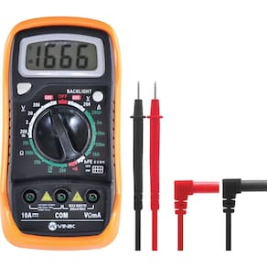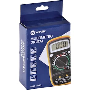 O multímetro digital Vmd1030 da Vinik é escolha certa para quem necessita aferir aparelhos eletrônicos com precisão e segurança. Com este multímetro é possível medir tensão contínua e alternada Volts Corrente Ampere e resistência Ohms . Possui função de backlight, iluminação em caso de lugares com pouca luminosidade. Possui case de proteção com suporte para mantê-lo inclinado e pegada ante deslizante, aumentando a aderência da mão devido a capa de borracha. Display: 3 Dígitos 1999 Tensão DC: 200mV - 600V 0.5% + 2 Tensão AC: 200V - 600V 1.2% + 10 Corrente DC: 200 A - 10A Corrente AC: 200/2000/20000/200000/2000000 Ohms Mudança de Faixa: Mudança de Faixa Manual Teste de Transição: Sim, Teste de Continuidade/Diodo: Sim, Data Hold: Sim, LCD Backlight: Sim, Alimentação: 9V - não incluso, Dimensão do Produto: 69x138x31mm, Peso: 170g, Conteúdo da embalagem - Multímetro Analógico, - Manual do Usuário, - 1 Ponta de prova, Ean: 7898547287823