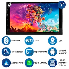 PRINCIPAIS CARACTERÍSTICAS MULTIMÍDIA: - Tela full touch capacitiva de 7" polegadas com resolução de 1024P; - Sistema Android com processador Quad-Core; - 2GB de RAM embutido + capacidade de memória FLASH EMMC de 32GB; - 2 conexões USB traseiras; - Conexão Bluetooth para ligações e músicas através de aparelhos celulares; - Espelhamento de celulares Android e IOS via USB e sem fio; - Conectividade com controles de som de volantes (consulte suporte do veículo); - 1 Entrada para Câmera de Ré; - Potência 4x60W RMS.