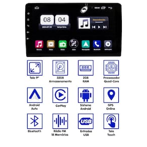 PRINCIPAIS CARACTERÍSTICAS: - Multimídia Android Full Touch; - Tela 9 Polegadas de Vidro; - Android Auto com e sem fio; - CarPlay com e sem fio; - Memória Ram: 2GB; - Memória Internos: 32GB - Bluetooth; - Resolução de Imagem 1024x600; - Sistema Operacional: Android; - 2 entradas USB; - 1 Entrada para Câmera de Ré; - 1 Entrada de Áudio e Vídeo; - 1 Saída de Áudio e Vídeo; - 1 Saída de Subwoofer; - GPS online; - Wifi Integrado; - Processador Quad-core; - Potência 4x60W RMS;