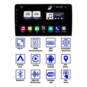 PRINCIPAIS CARACTERÍSTICAS: - Multimídia Android Full Touch; - Tela 9 Polegadas de Vidro; - Android Auto com e sem fio; - CarPlay com e sem fio; - Memória Ram: 2GB; - Memória Internos: 32GB - Bluetooth; - Resolução de Imagem 1024x600; - Sistema Operacional: Android; - 2 entradas USB; - 1 Entrada para Câmera de Ré; - 1 Entrada de Áudio e Vídeo; - 1 Saída de Áudio e Vídeo; - 1 Saída de Subwoofer; - GPS online; - Wifi Integrado; - Processador Quad-core; - Potência 4x60W RMS;