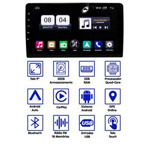 PRINCIPAIS CARACTERÍSTICAS: - Multimídia Android Full Touch; - Tela 9 Polegadas de Vidro; - Android Auto com e sem fio; - CarPlay com e sem fio; - Memória Ram: 2GB; - Memória Internos: 32GB - Bluetooth; - Resolução de Imagem 1024x600; - Sistema Operacional: Android; - 2 entradas USB; - 1 Entrada para Câmera de Ré; - 1 Entrada de Áudio e Vídeo; - 1 Saída de Áudio e Vídeo; - 1 Saída de Subwoofer; - GPS online; - Wifi Integrado; - Processador Quad-core; - Potência 4x60W RMS;