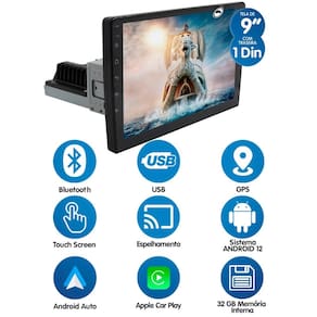 PRINCIPAIS CARACTERÍSTICAS: - Multimídia Android 1 Din Full Touch; - Tela 9" Polegadas de Vidro com painel IPS; - Sistema Operacional Android 12; - Função CarPlay e AndroidAuto conectividade com e sem fio - Bluetooth 4.1; - Resolução de Imagem 1024x600; - Processador Quard-Core - Memória RAM: 2GB; - Memória INTERNA: 32GB; - 7 Opções de Cores nos botões laterais; - 2 Entradas USB - 1 Entrada para Câmera de Ré - 1 Entrada para Câmera Frontal - 1 Entrada de Áudio e Vídeo; - 1 Saída de Áudio e Vídeo; - 1 Saída de SubWoofer; - GPS integrado (mapas a parte); - Wi-fi integrado; - Possui 48 opções de layout; - Possui 6 opções de menu; - Potência 4x60W RMS; - 2 Fios SWC para comando de volante (Grava até 10 funções); - Aplicativo EasyConnect para espelhamento de celular.