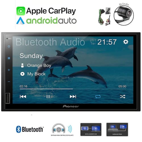 Tela de 7" Touchscreen Capacitiva Espelhamento de Smartphone (Android) Bluetooth para Ligações Hands-free e Streaming de Áudio Rádio FM Porta USB Entrada AUX 2 Pares de Saídas RCA Pré-amplificadas Saída de Vídeo para Monitor Traseiro Entrada para Câmera de Ré Entrada para 2° Câmera Entrada para Comando de Volante.