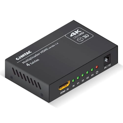O Multiplicador de Vídeo HDMI - 4 Saídas Comtac transmite um único sinal de áudio e vídeo de alta definição para quatro telas HDMI simultaneamente. Acompanha fonte de alimentação externa para melhor eficiência e qualidade do sinal. Compatível com os formatos de imagem Full HD, 3D, 2K e 4K.