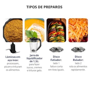 Tenha tudo que você precisa para preparar seus alimentos, um liquidificador, mixer, cortador espremedor, ralador, triturador e fatiador.