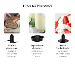 Suas características incluem um fácil encaixe de acessórios, garantindo uma troca rápida e simples entre as funções de processamento. Você pode preparar entradas, saladas, molhos, sucos, petiscos, massas, bolos e tudo o mais que você quiser criar.