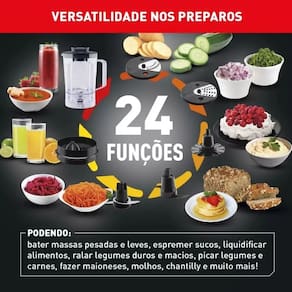 processador, liquidificador, fatiador, emulsificador, espremedor de frutas e dois raladores.