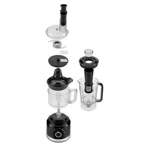 - 5 em 1 01 copo de liquidificador, 01 Jarra do processador, 01 adaptador de lâminas, 01 lâmina de fatiar, 01 lâmina de ralar e 01 lâmina processadora e 01 espremedor de frutas (peneira e cone). Copo plástico do Liquidificador com capacidade total para 2,7 litros e útil de 1,5 litros, com sobre tampa dosadora e filtro