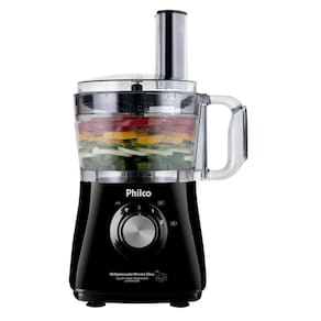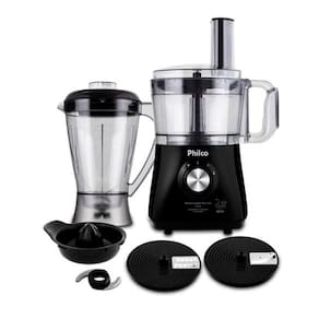 Possui acessórios que executam múltiplas funções: 01 copo de liquidificador 01 lamina de ralar 01 lamina de fatiar 01 espremedor 01 lamina de processar