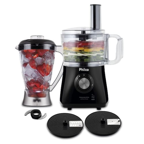 O liquidificador, prepara sucos, vitaminas, coquetéis, sopas, molhos, cremes e muito mais. Para isso, possui um copo com graduação, capacidade total de 2,2 litros e lâmina removível, com anel de vedação. O processador, processa todos os tipos de frutas, vegetais, queijos, carnes, grãos, coco, torradas, cebola, alho e outros. E para fazer tudo isso, acompanha jarra com capacidade para até 1,2 litros.Além de 2 velocidades + pulsar, que garantem a eficiência do serviço.