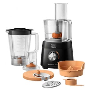 1 unidade motora, 1 jarra de processador, 1 tampa, 1 faca processadora, 1 jarra de liquidificador, 1 lâmina de ralar, 1 lâmina de fatiar, 1 moedor de grãos, 1 espremedor, 1 batedor de massas, 1 manual e 1 certificado de garantia.