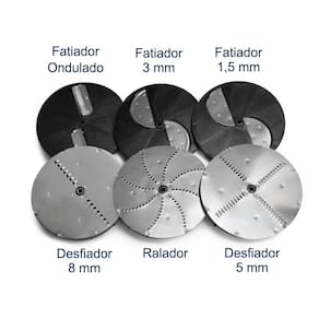 Os discos incluídos são: 1 fatiador de 1,5mm, 1 fatiador de 3,0mm, 1 ralador, 1 fatiador de ondas, 1 desfiador de 5mm e 1 desfiador de 8mm.