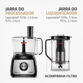 JARRA DO PROCESSADOR DE 3,2 LITROS: A capacidade útil é de 2 litros. O item é ideal para processar carnes, queijos, vegetais, grãos, temperos, entre outros.