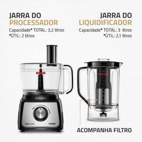 Multiprocessador 7 em 1 com 1000W de potência, jarra do processador de 3.2L (2L útil) e jarra do liquidificador de 3L (2.1L útil). Inclui 6 acessórios: filtro, lâmina picadora/batedora, lâmina fatiadora, lâmina raladora/granuladora, lâmina palitador e espremedor. Possui 2 velocidades + função Turbo, bocal alimentador, peças removíveis, trava de segurança e pés antiderrapantes. Material BPA Free.Acessórios