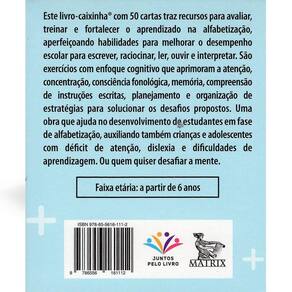 Este livro-caixinha® com 50 cartas traz recursos para avaliar, treinar e fortalecer o aprendizado na alfabetização, aperfeiçoando habilidades para melhorar o desempenho escolar para escrever, raciocinar, ler, ouvir e interpretar. São exercícios com enfoque cognitivo que aprimoram a atenção, concentração, consciência fonológica, memória, compreensão de instruções escritas, planejamento e organização de estratégias para solucionar os desafios propostos. Uma obra que ajuda no desenvolvimento de estudantes em fase de alfabetização, auxiliando também crianças e adolescentes com déficit de atenção, dislexia e dificuldades de aprendizagem. Ou quem quiser desafiar a mente. Faixa etária: a partir de 6 anos