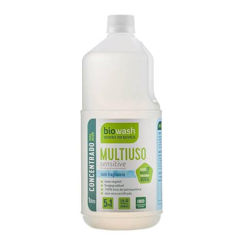 Multiuso Concentrado Natural Sensitive Sem Fragrância 1L - Biowash O multiuso concentrado natural sensitive sem fragrância da biowash é um multiuso para limpeza em geral concentrado classificado como um produto ecoeficiente, por ser totalmente biodegradável e isento de fosfatos. Sua fórmula 100% natural é composta de tensoativos derivados de óleos vegetais, matérias primas de fontes renováveis. É excelente para remoção de sujeira difíceis. Possui ph neutro, não agride as mãos ou superfícies a serem limpos, não é corrosivo ou inflamável. É um produto concentrado e por isso, além de eficiente, rende muito mais.Características Produto 100% natural certificado pelo ibd Biodegradável e hipoalergênico Rende até 28 diluições Sem fragrânciaIndicações o multiuso concentrado natural sensitive sem fragrância da biowash é indicado para limpeza geral de cozinhas, banheiros, pisos, paredes, vidros, espelhos azulejos, toda e qualquer superfície lavável.Ingredientes Composição: ácido graxo de coco sulfatado, alquilpoliglucosídeo, coadjuvantes, corretor de ph, espessante e água.ibg. reciclo. sem_teste_em_animais.hipoalergenico.fórmula livre de: parabenos, cloros, fosfatos, corantes sintéticos, fragrâncias artificiais, ingredientes derivados de petróleo e ingredientes de origem animal. Não é testado em animais.Importante: por conter ingredientes naturais, este produto poderá sofrer variações em seu aspecto físico, porém isso não altera sua qualidade e eficiência.Modo de usar aplique o multiuso sensitive sem fragrância da biowash na superfície a ser limpa, se necessário, esfregue com esponja e vassoura em seguida passe um pano úmido. Não é necessário enxaguar.Diluições e aplicações:média: 5 tampinhas 1:25 = rende 28 diluições5 tampas 35ml do multiuso concentrado + água = 1 frasco de 620 ml de multiuso para limpeza de cozinha, banheiro, piso, carpete, estofado, paredes, azulejos, vidros, fórmicas etc.Forte: 13 tampinhas 1:6 = rende 10 diluições 13 tampas 90ml do multiuso concentrado + água = 1 frasco de 620ml de multiuso para limpeza pesada de graxas, coifas, exaustores, frigideiras, grelhas, churrasqueiras, máquinas, motores, desencerar pisos etc.Lava roupas: 1 tampinha1 tampa 7ml por quilo de roupa = rende 28 lavagens de 5kg cada.Precauções em caso de contato acidental com os olhos, lavar com água abundantemente. Manter fora do alcance de crianças. Conservar em local fresco. A validade do produto é de 24 meses a partir da data de fabricação. Uso externo. Não ingerir.