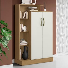 Multiuso Sapateira Florença, design diferenciado e versátil para complementar seu quarto. Estrutura em MDP (15/12 mm) com acabamento em Verniz. Possui portas com dobradiças metálicas, puxadores em plástico, nichos laterais e prateleiras internas. Este produto será entregue em 1 volume.