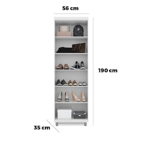 Multiuso Sapateira Isabele com Chave O Multiuso Sapateira Isabele com Chave pode te ajudar com a organização da sua casa! Com design versátil, esse belo móvel pode ser utilizado em diferentes ambientes para organizar roupas, sapatos, acessórios, roupas de cama ou produtos de limpeza. Confeccionado com materiais de altíssima qualidade, possui estrutura com excelente resistência, acabamento em pintura UV/TX e uma coloração maravilhosa. Além de tudo isso, possui duas portas, amplo espaço interno, prateleiras internas para melhor aproveitamento, pés que facilitam a limpeza do local e pode ser fechado com chave.\nMedidas\nAltura 190 cm\nLargura 56 cm\nProfundidade 35 cm\nCaracterísticas\nModelo Multiuso Sapateira Isabele\nTipo do produto Multiuso Sapateira\nFabricante Rud Rack\nMaterial MDP / MDF\nPortas 02\nPés 04\nMaterial dos Pés PVC\nPrateleira 05\nPossui Chave Sim\nTipo de Pés PVC\nGarantia 3 meses\nInformações Importantes\nObjetos decorativos que porventura apareçam na foto, não acompanham o produto. Não nos responsabilizamos pela montagem/instalação dos produtos.\nMontagens, desmontagens e instalações são responsabilidades do cliente. Indicamos que contrate uma empresa de montagem ou um montador de sua confiança.\nAlém disso, favor verificar se os pés e acessórios estão dentro do forro inferior do produto. Em suma, todas as informações divulgadas sobre o produto são de responsabilidade do Fabricante.\nAs cores do produto podem variar de acordo com o seu monitor, a iluminação do ambiente em que você está e até mesmo a sua percepção visual. Além da cor, pequenos detalhes e acabamentos podem não ficar evidentes na foto, por isso as imagens são meramente ilustrativas.