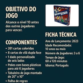 Mergulhe em partidas cheias de estratégia, humor e competição com este envolvente jogo de cartas com tabuleiro Ideal para jogar com amigos ou em família, ele oferece horas de diversão para 3 a 6 jogadores em disputas dinâmicas onde o objetivo é simples: subir de nível até alcançar o nível 10. Durante o jogo, os participantes enfrentam desafios, utilizam cartas especiais e interagem entre si - seja colaborando ou sabotando. Com 261 cartas ilustradas, tabuleiro temático, peões personalizados e dado exclusivo, cada partida se torna única e imprevisível. Este é o jogo ideal para quem busca diversão em grupo, com mecânicas estratégicas, reviravoltas inesperadas e muita interação social. Fácil de aprender, mas com muita profundidade , é perfeito para iniciantes e veteranos dos jogos de tabuleiro. Destaques do Produto Estimula o raciocínio lógico e a criatividade Ideal para adultos, adolescentes e toda a família Excelente opção de presente para quem ama jogos de tabuleiro Regras simples, partidas dinâmicas e muito envolvimento entre os jogadores Ficha Técnica Tipo de jogo: Jogo de cartas com tabuleiro Número de jogadores: 3 a 6 participantes Idade recomendada: A partir de 10 anos Tempo médio de jogo: 60 a 120 minutos Conteúdo da caixa: 261 cartas ilustradas 1 tabuleiro de jogo aprox. 50 x 25 cm 6 peões com base 1 dado personalizado Manual de instruções Idioma: Português Indicado para: Famílias, grupos de amigos, festas e encontros Homologação Inmetro: CE-BRI/IQB 005923 53374/19-038 Marca: Não Informado