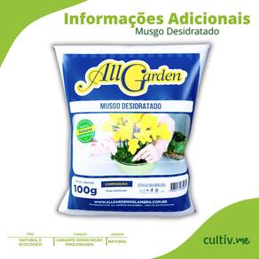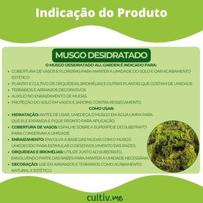 Características * Marca: All Garden; * Tipo: Musgo Sphagnum Desidratado; * Peso líquido: 100g; * Produto natural e ecológico; * Composição: Musgo desidratado; * Uso indicado: Jardinagem, kokedamas, cultivo de orquídeas, substrato para plantas