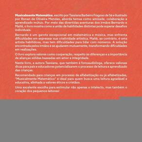 O livro infantil Musicalmente Matemático, escrito por Tassiana Barbeiro Fragoso de Sá e ilustrado por Ronan de Oliveira Mendes, é uma obra encantadora que aborda temas como amizade, colaboração e aprendizado mútuo. Por meio das divertidas aventuras dos irmãos Bernardo e Maitê, o livro mostra como a união de habilidades distintas pode superar desafios individuais. Bernardo é um garoto excepcional em matemática e música, mas enfrenta dificuldades em expressar sua criatividade artística. Maitê, ao contrário, é uma artista habilidosa com dificuldades para lidar com números. A solução encontrada pelos irmãos é se ajudarem mutuamente, transformando dificuldades em realizações. Com ilustrações vibrantes e texto envolvente, o livro explora valores como cooperação, respeito às diferenças e a importância de alianças sólidas baseadas em amor e integridade. Tassiana, que também é fonoaudióloga, oferece ainda valiosas dicas para pais e educadores potencializarem o processo de leitura e aprendizado das crianças. Recomendado para crianças em processo de alfabetização ou já alfabetizadas, "Musicalmente Matemático" é ideal para quem busca uma leitura agradável e educativa, alinhada a valores éticos e cristãos.Uma excelente escolha para estimular não apenas o intelecto, mas também o coração dos pequenos leitores!