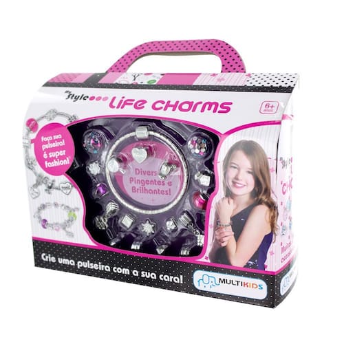 Crie uma pulseira com a sua cara. Vem com diversos pingentes que você pode customizar com pedrinhas brilhantes. Escolha os pingentes e monte como quiser. Os brinquedos Multikids aqui expostos possuem certificação Inmetro nas embalagens conforme o selo: OCP 0006/CE-BRI/IQB 006039.